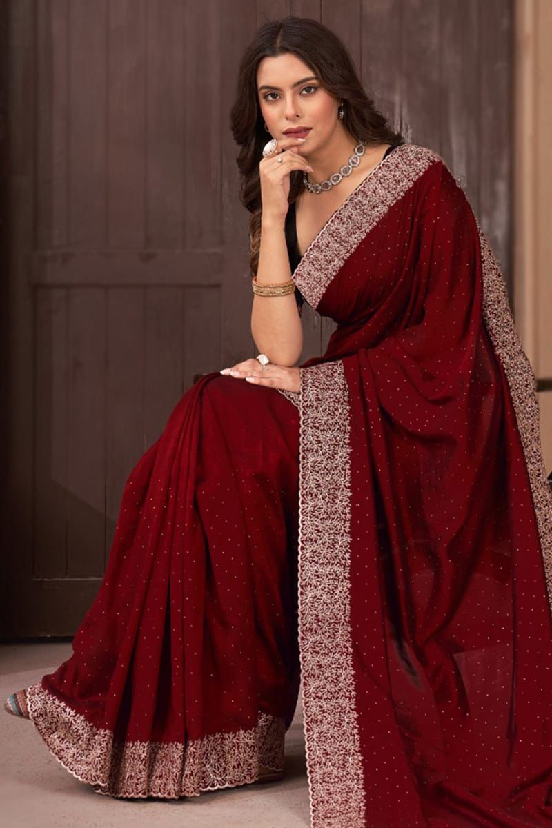 এই মেরুন কালারের শাড়ি টি ইন্ডিয়ান বিচিত্রা সিল্কের ফ্যাব্রিক দিয়ে তৈরী করা এবং সম্পূর্ণ শাড়ির আঁচল ও কুঁচি জুড়ে জরি কালার সুতার এমব্রয়ডারি কাজ এটিকে আরও আকর্ষণীয় করে তোলে এবং যেকোনো বিশেষ অনুষ্ঠানের পরিধানের জন্য উপযুক্ত।