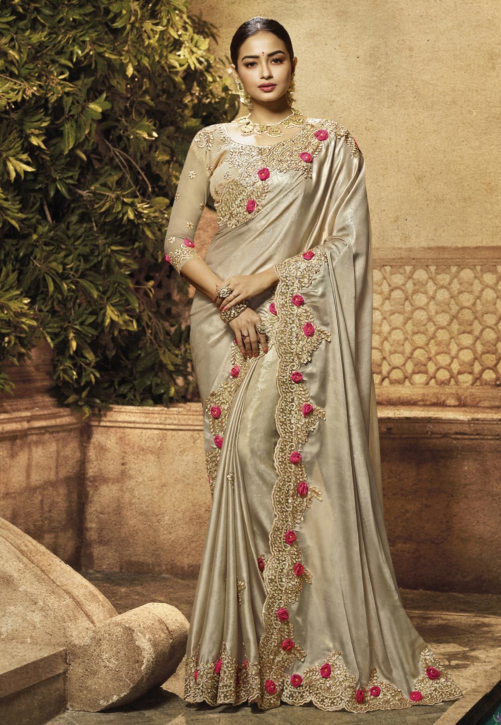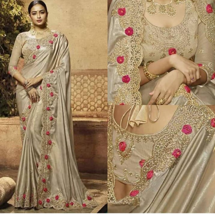 এই কালারের শাড়ি টি সিল্কের ফ্যাব্রিক দিয়ে তৈরী করা এবং সম্পূর্ণ শাড়ির আঁচল ও কুঁচি জুড়ে গোলাপি এবং জরি কালার সুতার এমব্রয়ডারি কাজ এটিকে আরও আকর্ষণীয় করে তোলে এবং যেকোনো বিশেষ অনুষ্ঠানের পরিধানের জন্য উপযুক্ত।